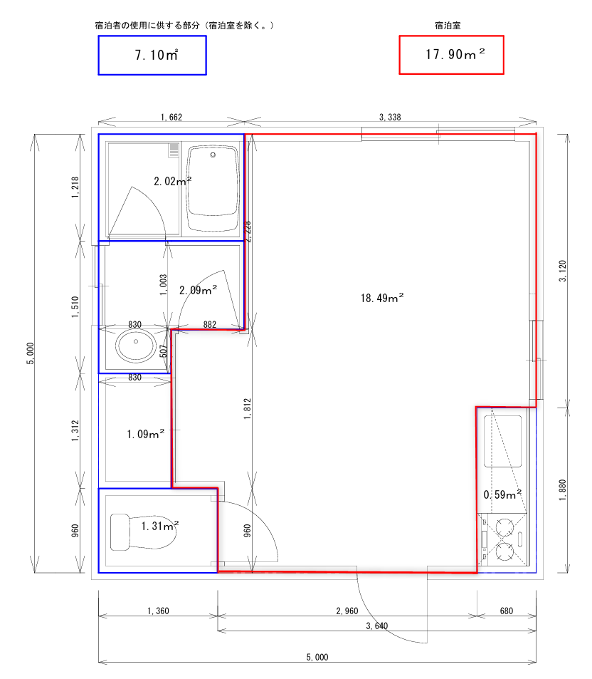 宿泊者が占有する面積のことを表します(宿泊者の占有する台所、浴室、便所、洗面所、廊下等であって、押入れや床の間は含みません。)。具体的には、簡易宿所の取扱いと同様に算定します。なお、内寸面積(壁の内側、実際の壁から壁までの距離を対象とした面積)で算定します。