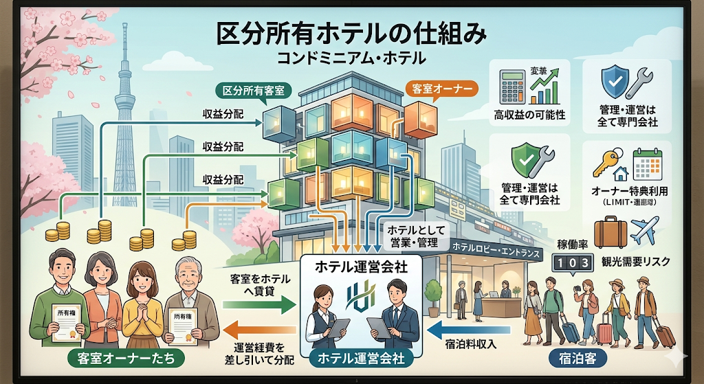 - 構造: 客室のオーナー(区分所有者)から部屋を借りてホテル運営を行う「区分所有型ホテル」